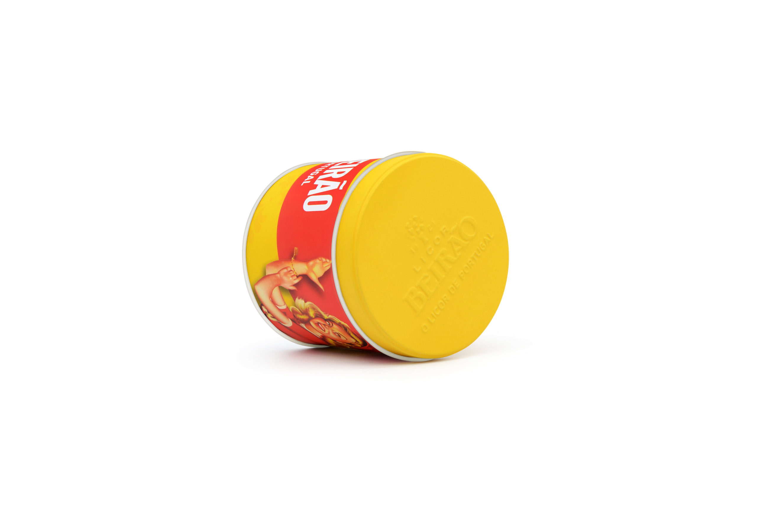 Embalagem de metal redonda para a marca LICOR BEIRÃO. Esta embalagem foi totalmente personalizada com impressão offset e com gravação em relevo na tampa.
